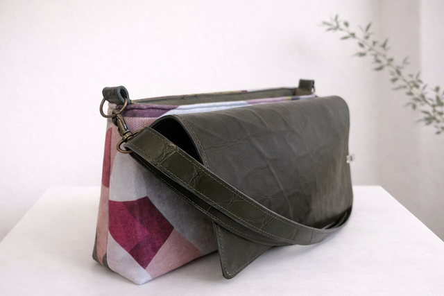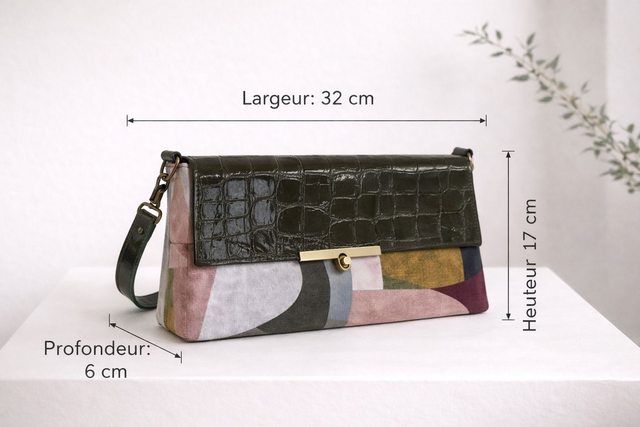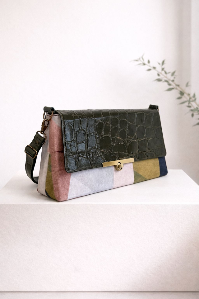 Sac bandoulière élégant en tissu a motif géométrique et cuir avec fermoir doré. Chic, moderne et pratique, idéal pour le quotidien comme pour les sorties.