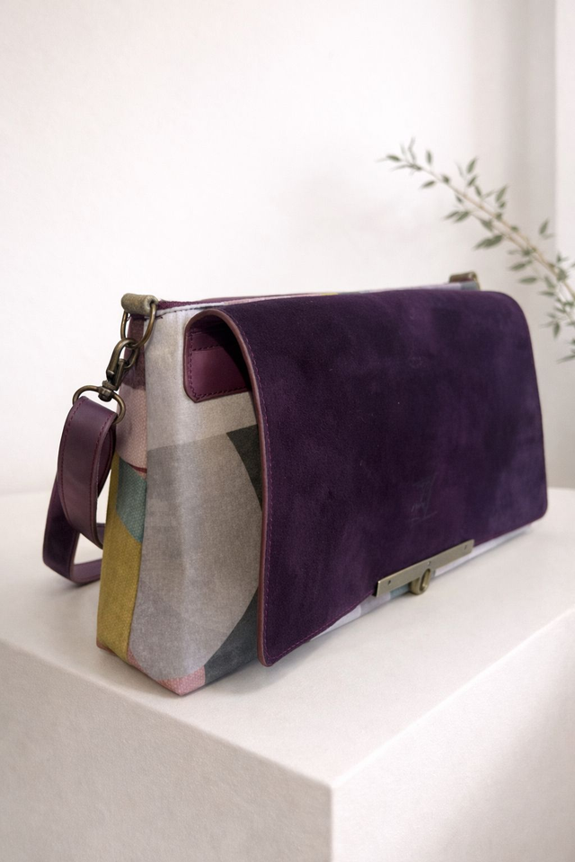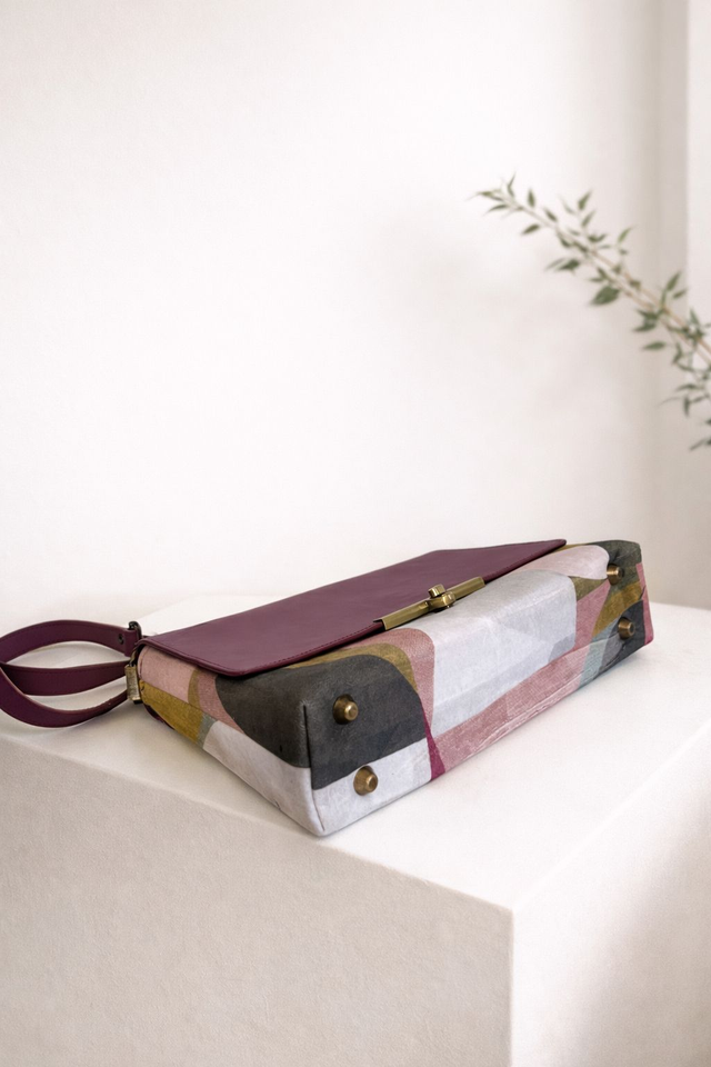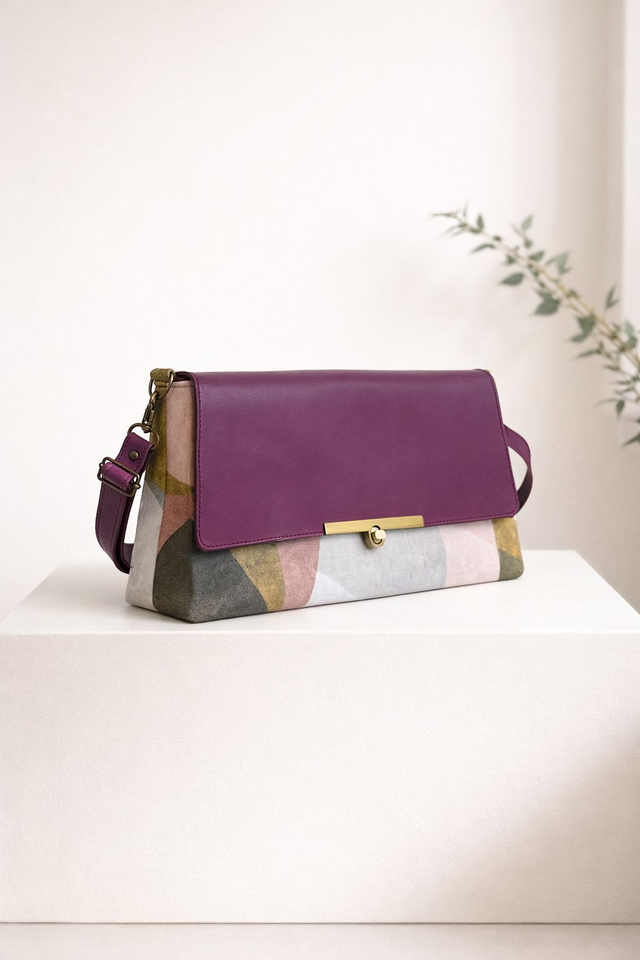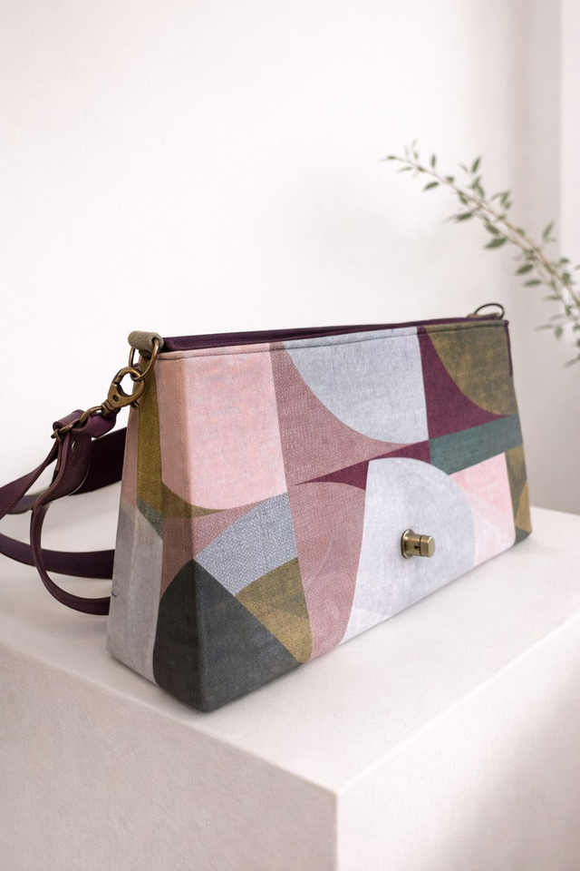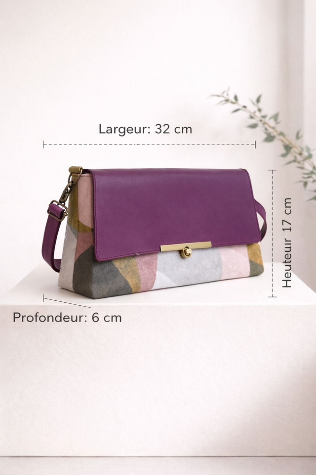 Sac bandoulière élégant en tissu a motif géométrique et cuir avec fermoir doré. Chic, moderne et pratique, idéal pour le quotidien comme pour les sorties.