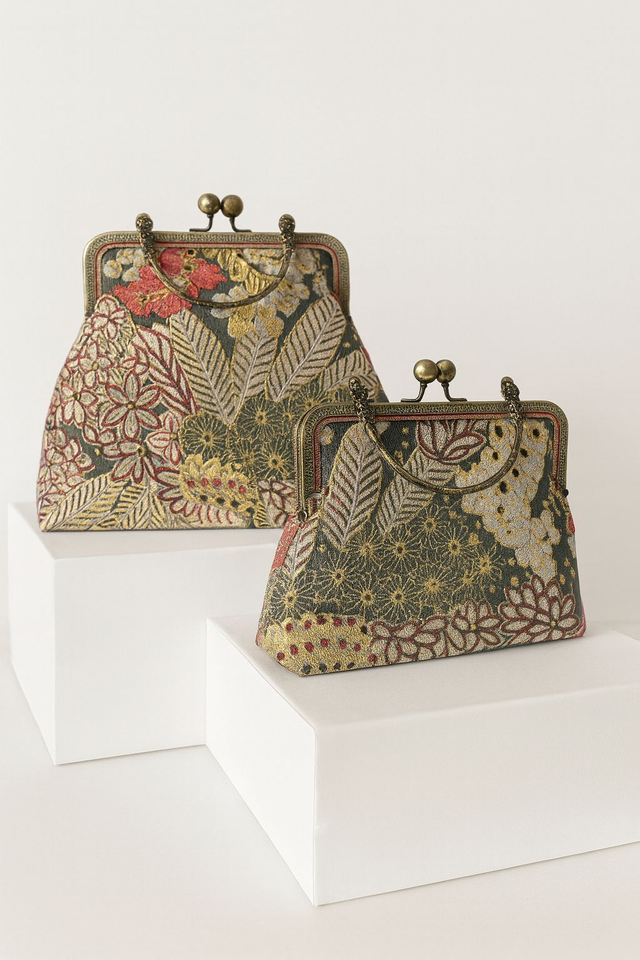 Sac à main en tissu d'ameublement au style rétro chic, doté d’un fermoir clic-clac en métal finition laiton. Son motif texturé apporte une touche élégante et originale. Compact et raffiné, il est idéal pour transporter vos essentiels avec style.