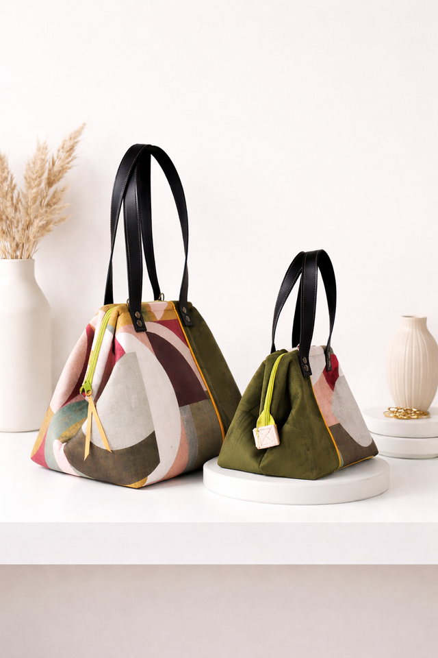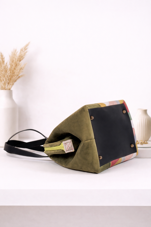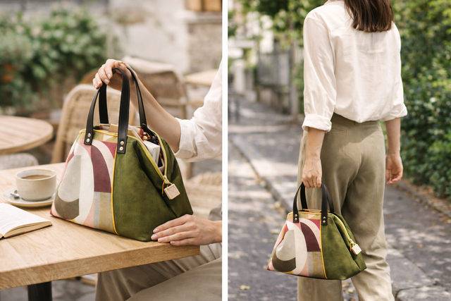 Le sac Lady B Olivia séduit par son design audacieux et son élégance naturelle. Son imprimé graphique aux tons doux et harmonieux, associé à un vert olive profond, crée un contraste raffiné et résolument contemporain.